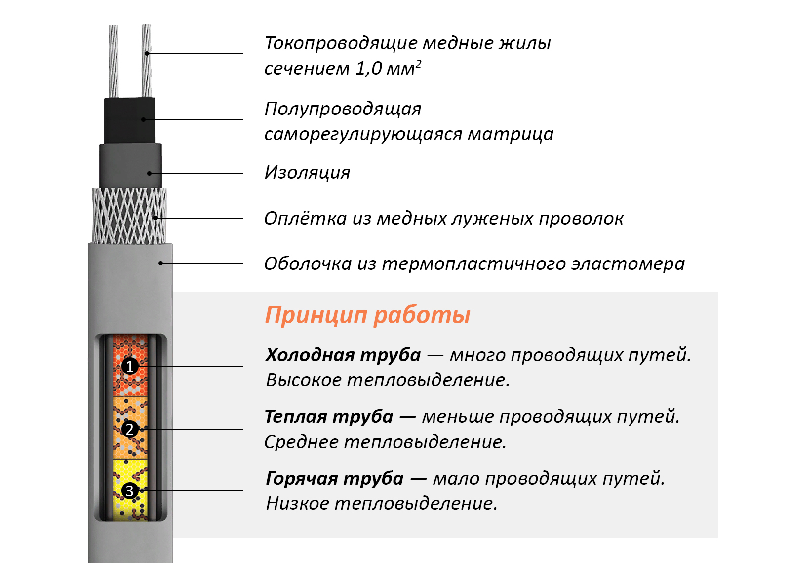 • Кабель самостоятельно регулирует мощность тепловыделения в зависимости от температуры обогреваемой поверхности.