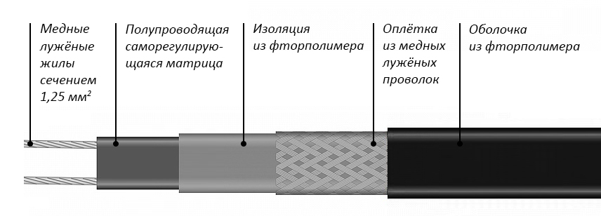 Саморегулирующийся кабель — автоматически регулирует мощность, в зависимости от окружающей температуры. Теплоотдача по всей длине кабеля может быть разной. Минимальный риск перегрева.