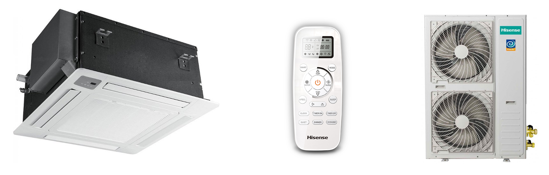 Инверторная кассетная сплит-система Hisense AUC-48UX4SFA/AUW-48U6SP1 рассчитана на работу в помещении площадью до 125 кв.м. Встраивается в подвесную потолочную конструкцию.
