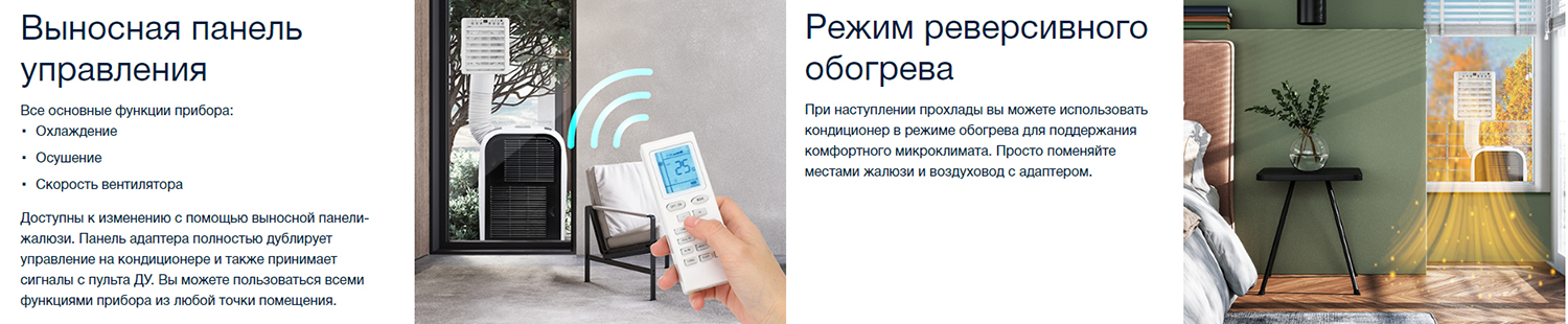 Уникальный мобильный кондиционер для внутреннего и наружного использования. Корпус имеет пыле-влагозащиту IP24, что позволяет устанавливать моноблок на балконе, веранде или улице (под навесом, во избежание попадания влаги внутрь прибора). В комплект входит специальная панель-жалюзи с блоком управления кондиционером, которая встраивается в окно или специально подготовленное отверстие. Таким образом кондиционер, установленный снаружи, через воздуховод будет подавать охлажденный воздух внутрь помещения, не занимая при этом жилое пространство и существенно снижая уровень шума при эксплуатации. Прибор можно также использовать для направленного охлаждения, используя на верандах и летних площадках.