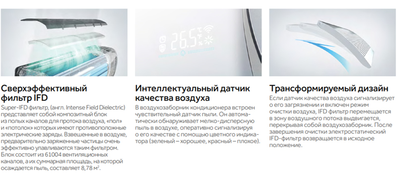 • Профессиональная очистка воздуха (IFD фильтр) — Кондиционер + очиститель воздуха в одном устройстве. Датчик качества воздуха кондиционера анализирует концентрацию частиц более 2,5 мкм. Если воздух в помещении загрязнен, новейший IFD фильтр перемещается в зону воздушного потока. IFD фильтр – это пористый материал включающий более 8616 отверстий-пор улавливающих самые мелкие частицы. Если функция очистки активирована, на фильтре формируется статическое электричество, повышающее эффективность фильтрации.