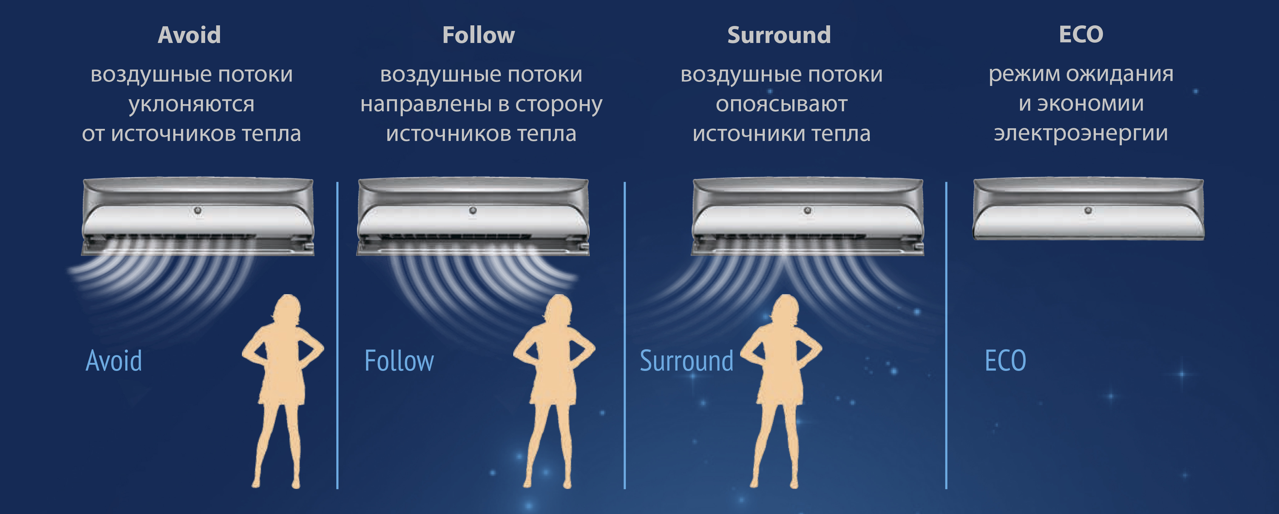 • Технология «I SENSE» — интеллектуальное сканирование помещения на источники тепла. В зависимости от полученных данных система выстраивает свою работу, создавая максимально комфортные температурные условия для пользователя.