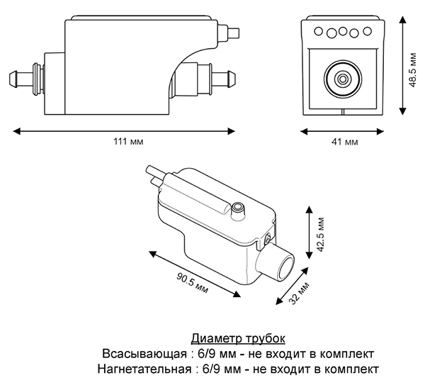 • Габариты (блок насоса): 111 x 41 x 48,5 мм