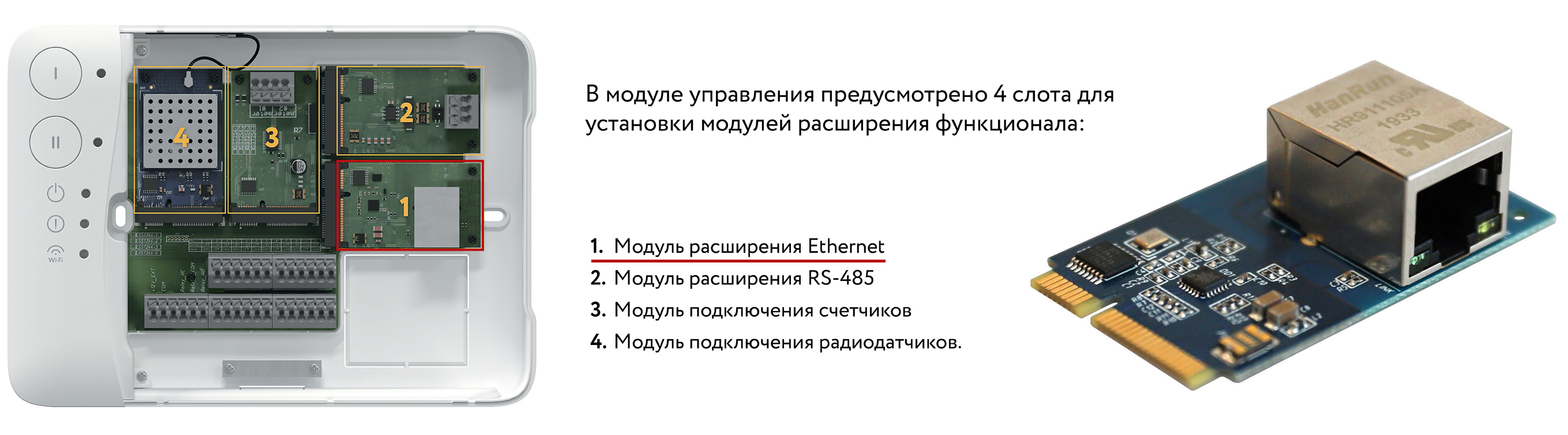 Cлужит для сетевого подключения модуля управления к маршрутизаторам в случае невозможности организации беспроводного подключения к сети Wi-Fi.