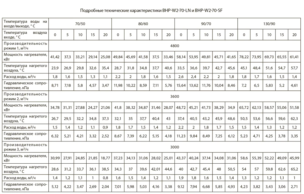 Тепловые характеристики приведены при температуре воздуха на входе +0 °С, максимальном расходе воздуха и максимальной температуре теплоносителя (указанной в таблице тепловой мощности от производителя).