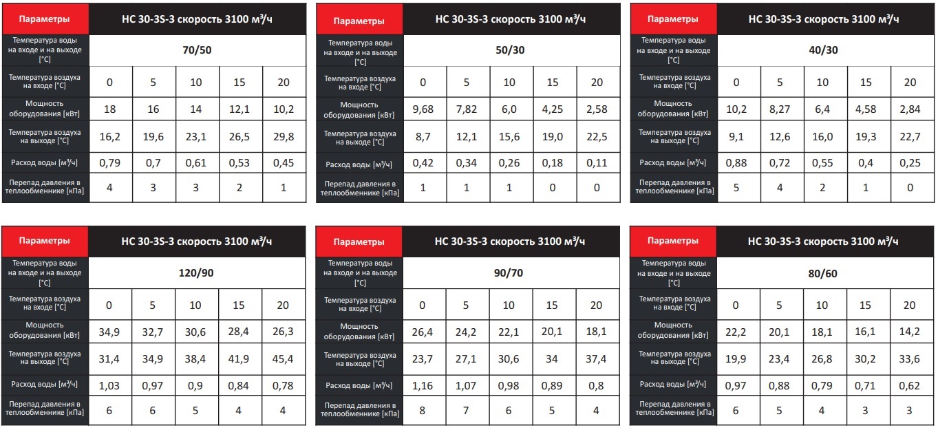 Тепловые характеристики приведены при температуре воздуха на входе +0 °С, максимальном расходе воздуха и максимальной температуре теплоносителя (указанной в таблице тепловой мощности от производителя).