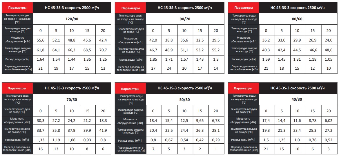 Тепловые характеристики приведены при температуре воздуха на входе +0 °С, максимальном расходе воздуха и максимальной температуре теплоносителя (указанной в таблице тепловой мощности от производителя).