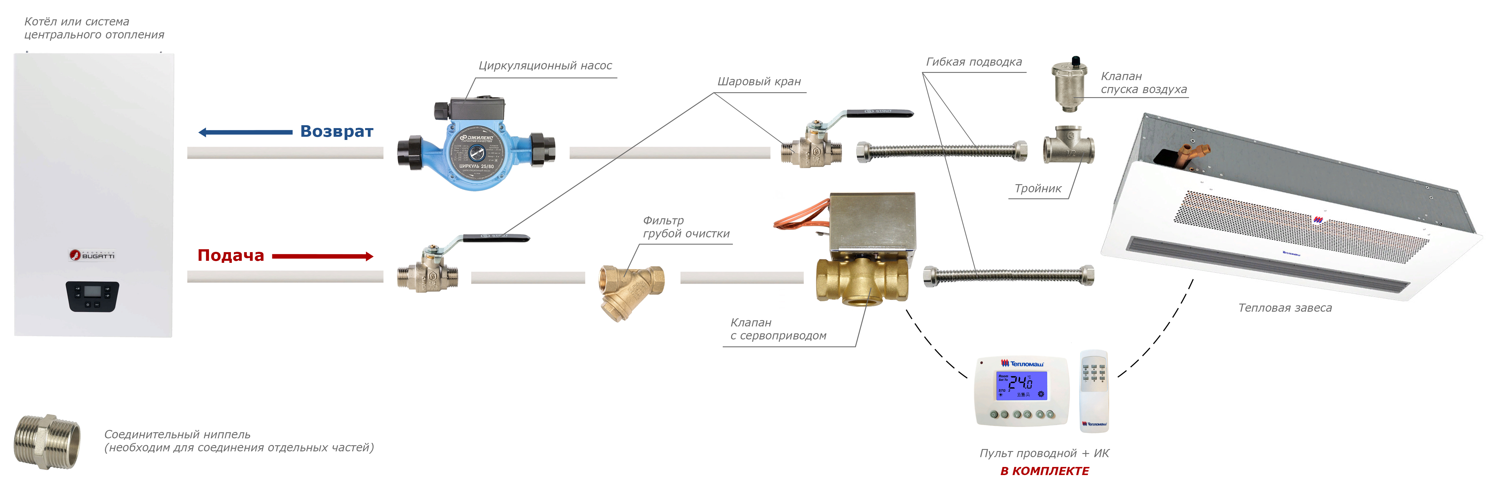 - Стандартная комплектация: завеса + проводной пульт HL10 с электронным термостатом — поддержание заданной температуры осуществляется за счет включения/выключения вентилятора и его работы на выбранной скорости. При достижении необходимого уровня температуры вентилятор завесы отключается, теплоноситель продолжает циркулировать.