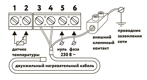 Выводы нагревательного мата подключаются к терморегуляторам следующим образом: