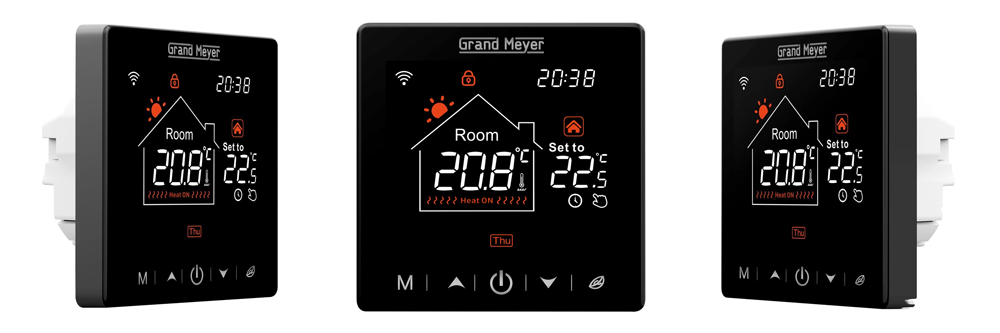 Линейка современных терморегуляторов Grand Meyer SN с функцией удаленного доступа по сети Wi-Fi предназначены для управления системами теплых полов. Укомплектован выносным датчиком температуры пола и оснащен встроенным датчиком температуры воздуха, на основании показаний которых происходит автоматическое поддержание заданной температуры. Устанавливается в стандартный подрозетник. Модель имеет большой информативный сенсорный дисплей, выполнена в 3 цветах – белый, золотой (шампань) и черный.